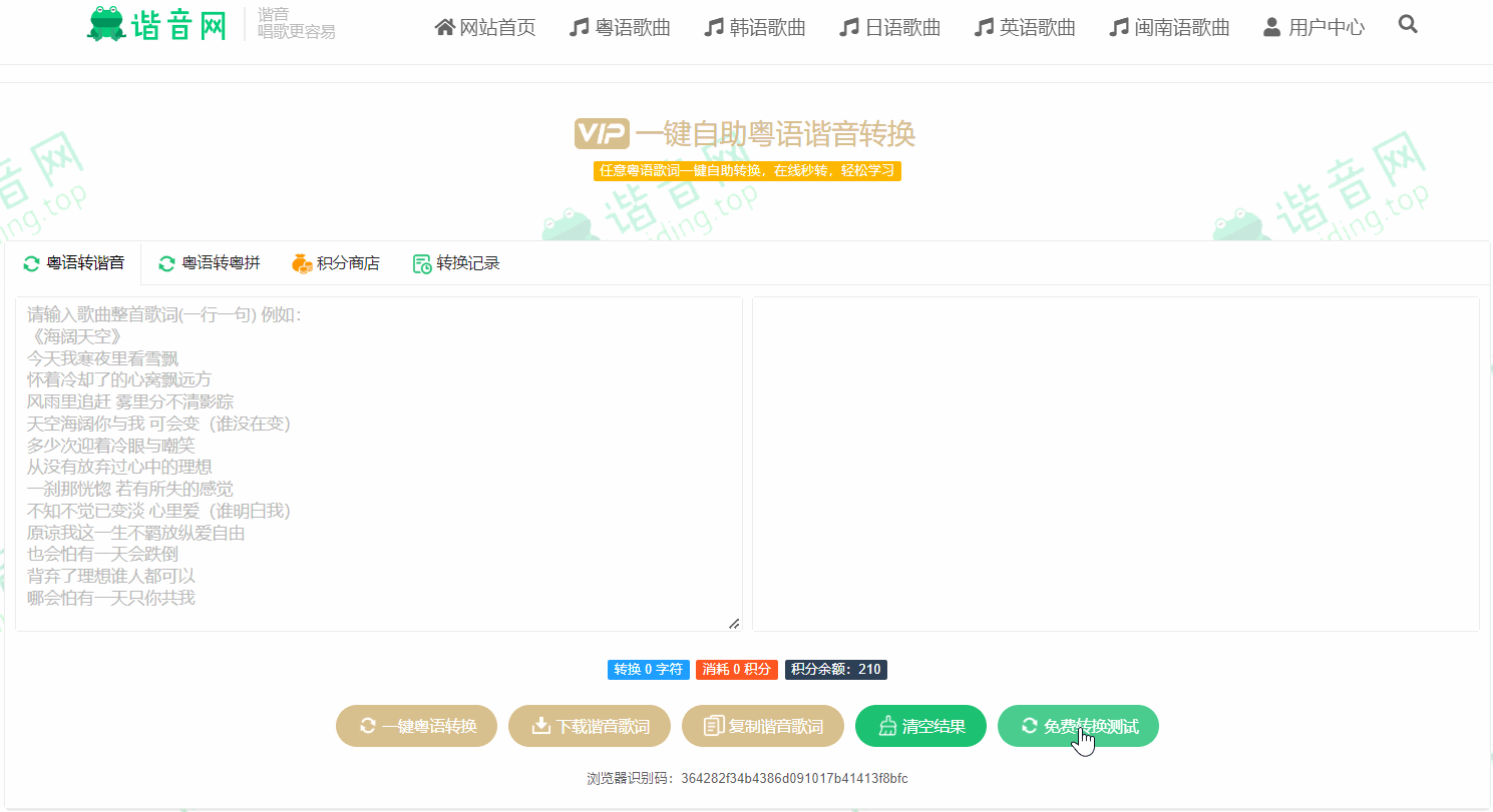 很多朋友找不到对应的歌曲,于是乎开发了这款一键粤语在线转换器,支持普通谐音和粤拼两种形式,需要哪种转换哪种,可以说完全解决了粤语学习发音的问题,请看截图:
